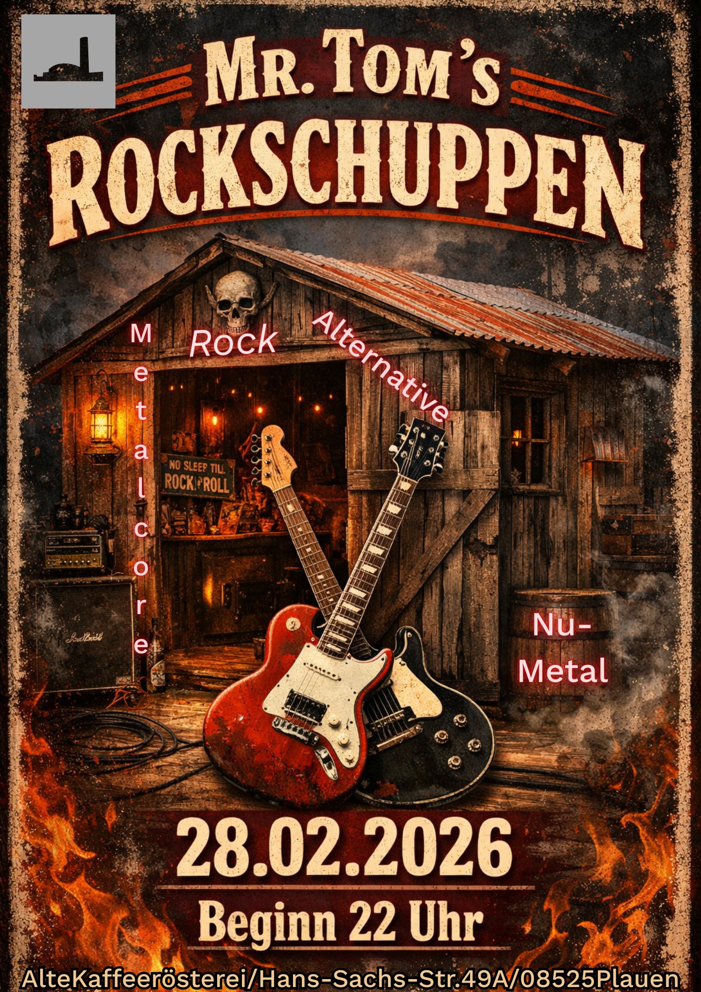 🔥 Rocknacht in Plauen! 🔥 Am 28.02.2026 bringt Mr. Tom’s Rockschuppen die Alte Kaffeerösterei zum Beben. Ab 22 Uhr gibt’s eine fette Mischung aus Metalcore, Alternative, Rock und Nu-Metal – laut, roh und direkt auf die Zwölf.