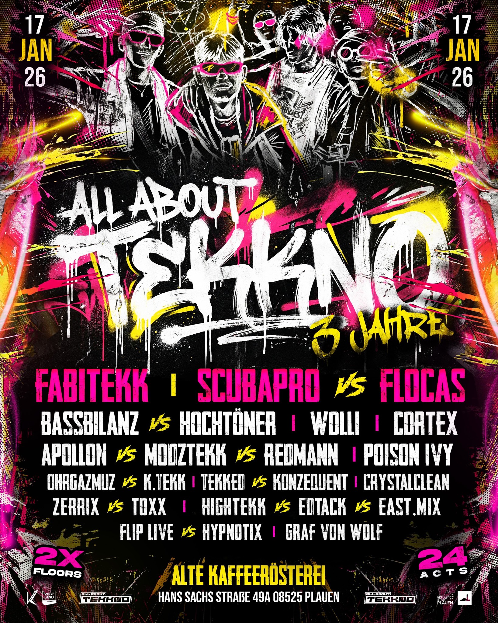 ▬▬▬▬▬ Specials ▬▬▬▬ ■ 2 Floors / 24 Acts ■ Derbe Massive Anlagen ■ 3 Jahre All About Tekkno STOFFBÄNDER ■ Garderobe Vorhanden ■ Parkplätze Vorhanden ■ Bahnhof in der Nähe ■ Giveaway